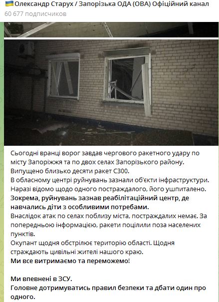"Утром враг нанес очередной ракетный удар по городу Запорожье и по двум селам Запорожского района. Выпущено около десяти ракет С300" - говорится в сообщении ОВА в Телеграм-канале.