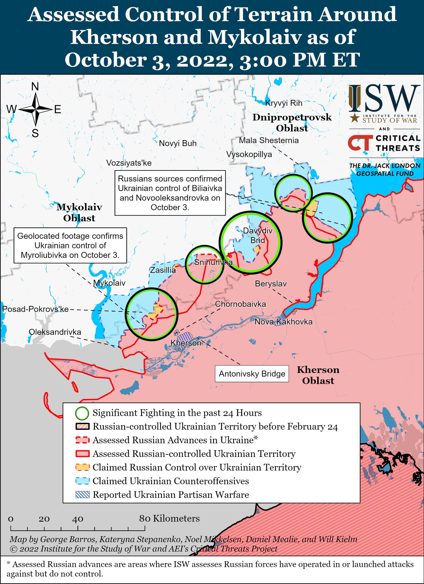 Институт указывает, что кадры в социальных сетях и рассуждения российских блогеров также показывают, что украинские силы продвигались к западу от трассы T0403, освобождая Крещеновку 1 октября.