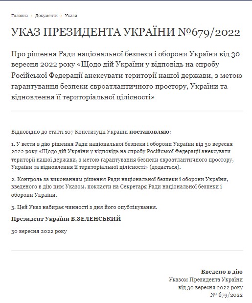 Президент Владимир Зеленский своим указом ввел в действие решение Совета национальной безопасности и обороны от 30 сентября о действиях Украины в ответ на попытку России аннексировать территории Украины, которым констатируется невозможность проведения переговоров с президентом России Владимиром Путиным.