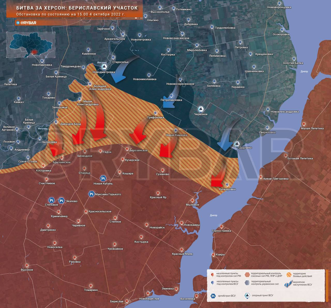 Судя по поступающим сведениям, там российские войска после начала наступления ВСУ отступают со всего севера региона. Также отход идёт и с Давыдова Брода на правом берегу Ингульца, в направлении которого украинские войска вели наступательные действия ещё с конца августа.