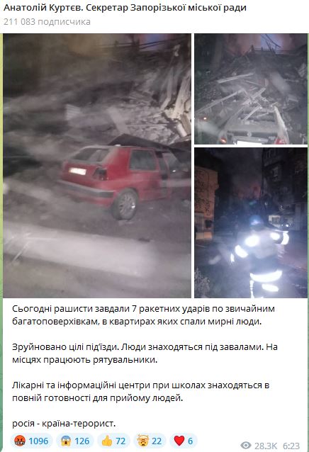 По предварительным данным, всего было 7 ракетных ударов по жилым многоэтажкам. Разрушены целые подъезды. Под завалами находятся люди. На местах работают спасатели. Больницы принимают пострадавших.