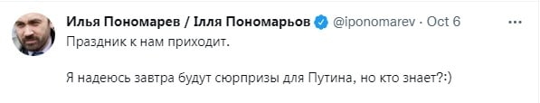 "Я надеюсь, завтра будут сюрпризы для Путина. Но кто знает?" - написал экс-депутат в Твиттере 6 октября.