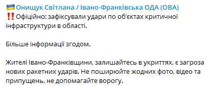 "Жители Ивано-Франковской области, оставайтесь в укрытиях, есть угроза новых ракетных ударов. Не распространяйте фото, видео и предположений, не помогайте врагу", - пишет председатель Ивано-Франковской обладминистрации Светлана Онищук в своем телеграм-канале.