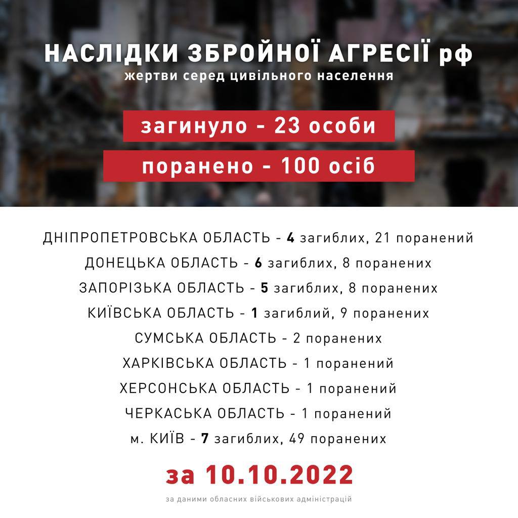 По данным областных военных администраций, жертвами вчерашнего массированного ракетного удара РФ по Украине стали 23 мирных жителя, еще 100 были ранены.