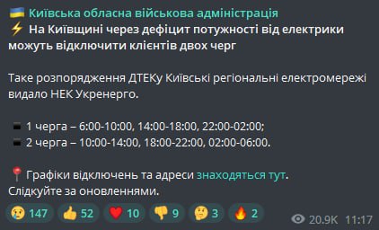 В Киевской области 12 октября от электричества могут отключить клиентов двух очередей. График
