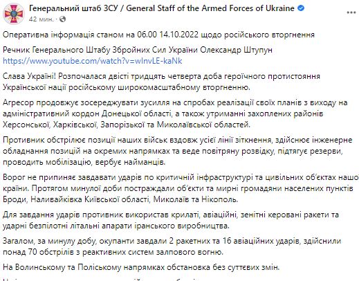Утром 14 октября Генштаб Вооруженных Сил Украины опубликовал сводку о ситуации на фронте.
