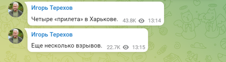 Мэр Харькова Игорь Терехов пишет о ракетных ударах по городу днем в пятницу, 14 октября. Зафиксировано минимум четыре прилета и еще несколько взрывов.