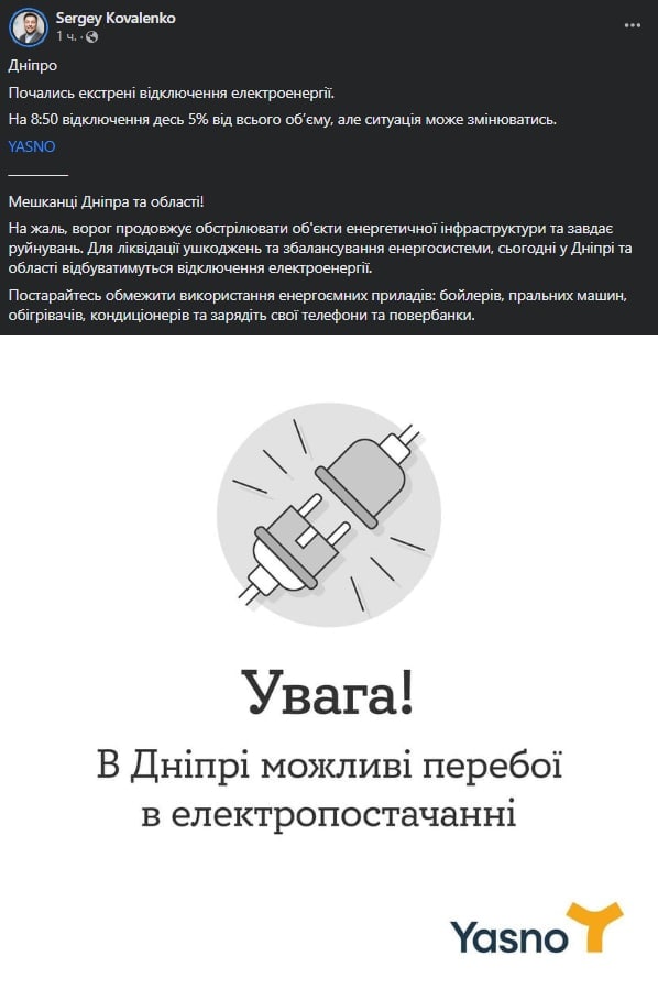 Экстренное отключение света начались в Днепре. Фото: соцсети
