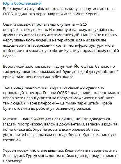 "Украинская армия не совершала и не будет совершать таких действий. Наши воины в первую очередь освобождают людей, а не территории. Для них важна человеческая жизнь и сохранение критической инфраструктуры города, чтобы эту жизнь можно было поддерживать в нормальном состоянии и дальше", - подчеркнул Соболевский.