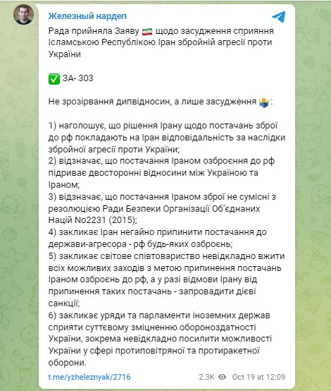 Верховная Рада приняла заявление об осуждении содействия Ираном вооруженной агрессии против Украины. За него проголосовали 303 нардепа в ходе заседания в среду, 19 октября.