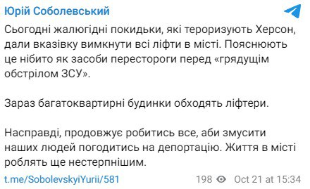 Назначенные РФ "власти" Херсонской области дали указание выключить все лифты в Херсоне. Об этом сообщил первый зампредседателя облсовета Юрий Соболевский в своем телеграм-канале.
