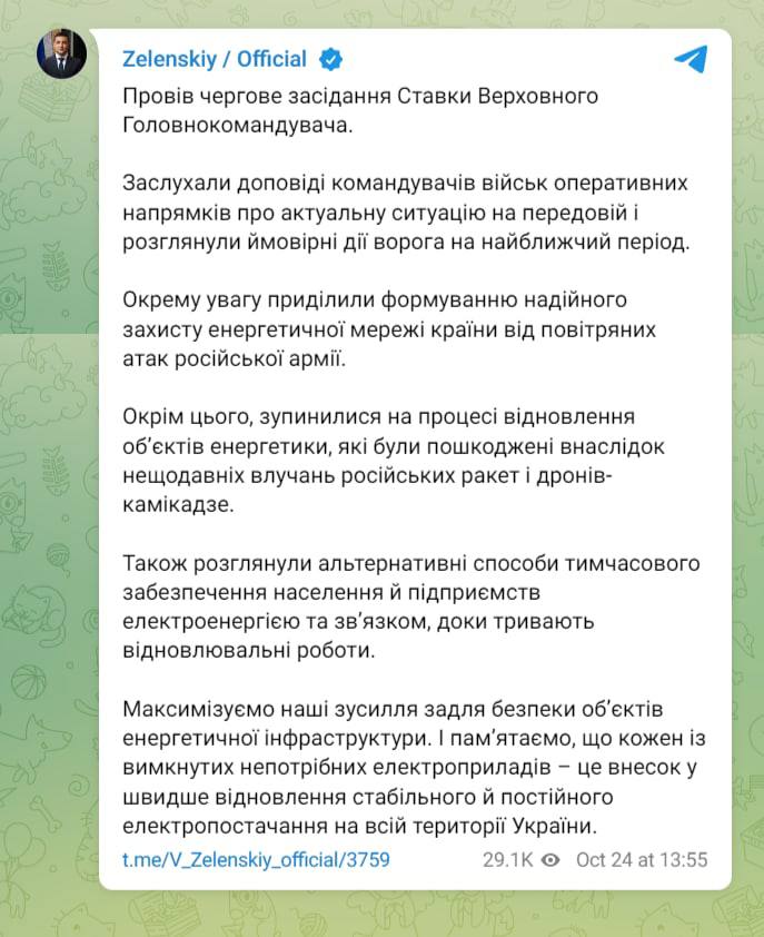 Президент Владимир Зеленский, в понедельник, 24 октября, провел заседание Ставки Верховного главнокомандующего.