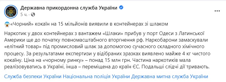 По заявлению пограничников, контейнер с кокаином пришел в Одессу еще до начала вторжения РФ в Украину, после доставки кокаин с шлаком в дальнейшем планировалось перевезти сухопутным путем в ЕС, а небольшую часть товара продать в Украине. Стоимость наркотиков, по оценке пограничников – 15 миллионов гривен. Перед реализацией кокаин должен был пройти химическую очистку от шлака.
