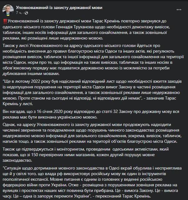 "Ситуация с соблюдением языкового законодательства в Одессе крайне возмутительна и неблагоприятна ещё и в свете того, что власти РФ используют русский язык как один из инструментов геополитической экспансии. Языковой вопрос является одним из главных в ведении Российской Федерацией войны против Украины. Поэтому размещённая с нарушениями наружная реклама на улицах и проспектах наших городов должна быть убрана. Это - требование закона. Это - требование времени. Это - один из залогов победы Украины", - написал Креминь.