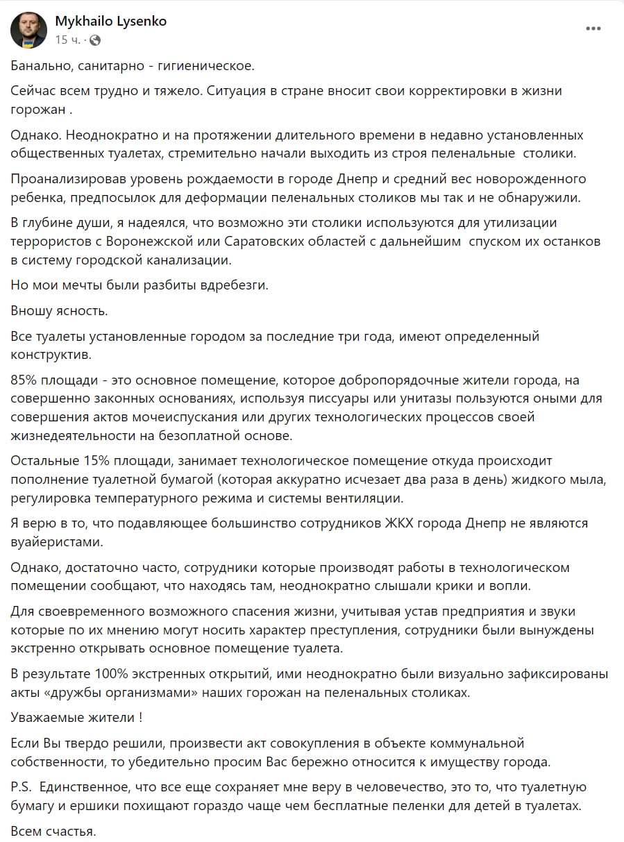 Заммэра Днепра Михаил Лысенко обратился к жителям города, которые используют пеленальные столики в общественных уборных для занятий сексом.