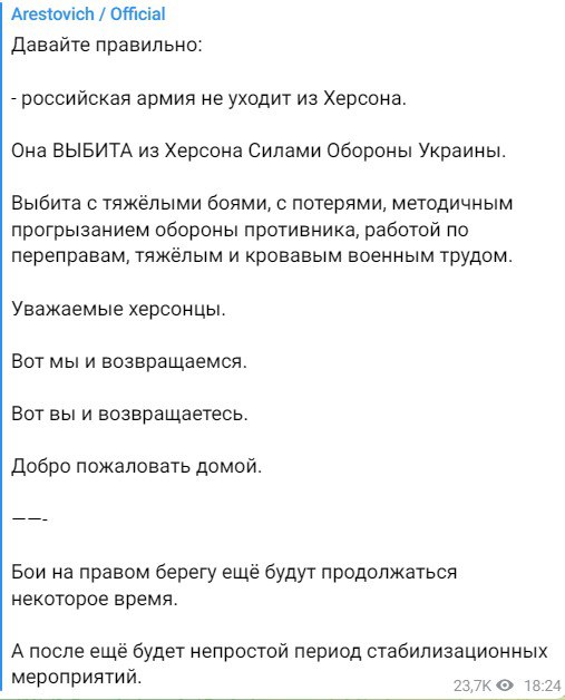 Арестович предупредил, что "бои на правом берегу ещё будут продолжаться некоторое время. А после ещё будет непростой период стабилизационных мероприятий".