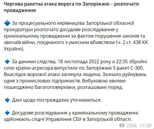 По данным прокуратуры, 18 ноября 2022 года в 22:35 по Запорожью было выпущено 5 ракет С-300.