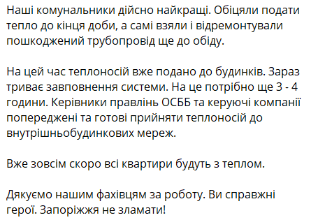 Секретарь горсовета Анатолий Куртев пишет, что поврежденный трубопровод уже отремонтирован, "еще 3-4 часа понадобится для наполнения системы и вскоре все квартиры, оставшиеся ранее без тепла, будут отапливаться".