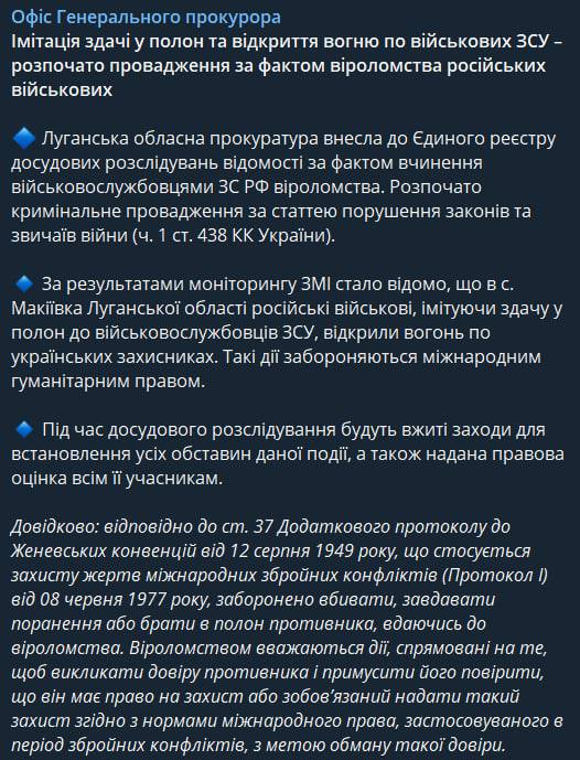 В заявлении генпрокуратуры говорится, что военные РФ имитировали сдачу в плен и открыли огонь по военнослужащим ВСУ.