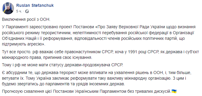 "Здесь все просто. РФ считает себя правопреемником СССР, хотя в 1991 году СССР как государство и субъект международного права прекратил свое существование. Поэтому и Россия не может иметь статус государства-наследника СССР. Абсурдно то, что государство-террорист может влиять на принятие решений в ООН и тем более ветировать их", - отметил Стефанчук.