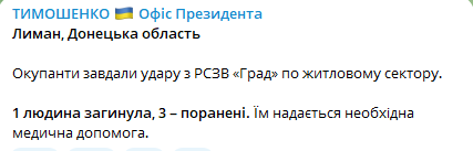 В результате обстрела 1 человек погиб, 3 – ранены. Людям оказывается необходимая медицинская помощь.