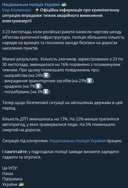 10:10 В течение недели после блекаута в Украине снизилась преступность.