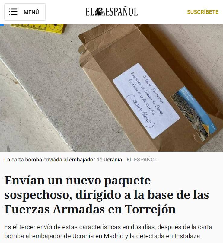 Первое письмо было адресовано послу Украины в Мадриде, второе - компании "Инсталаза", которая производит ракетные установки, которые Испания отправила Украине в начале войны.