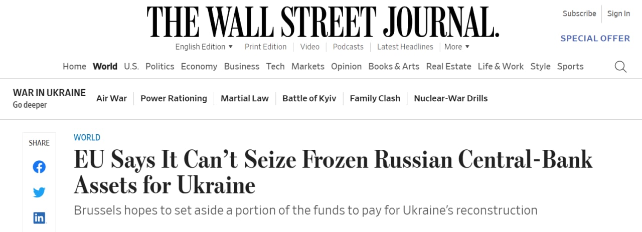 14.20 В ЕС признали, что не могут конфисковать замороженные активы Центробанка РФ из-за действия международного принципа государственного иммунитета, пишет The Wall Street Journal.