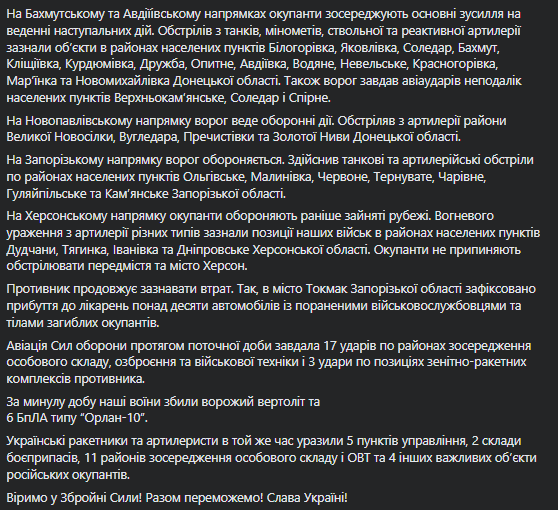 - На Купянском и Лиманском, Новопавловском и Запорожском направлениях враг ведет оборонительные действия. На Херсонском направлении россияне обороняют ранее занятые рубежи.