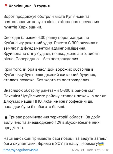 Сегодня, 8 декабря, около 04:30 утра россияне нанесли ракетный удар по Купянску Харьковской области. Ракета С-300 попала в землю под фундаментом админпомещения.