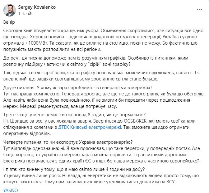 Об этом заявил гендиректор YASNO Сергей Коваленко в Фейсбуке.