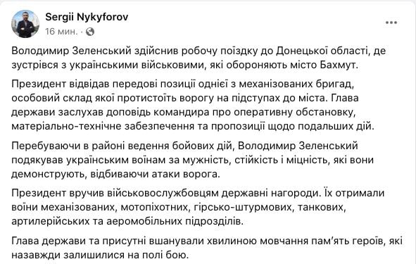 "Владимир Зеленский совершил рабочую поездку в Донецкую область, где встретился с украинскими военными, обороняющими город Бахмут. Президент посетил передовые позиции одной из механизированных бригад, личный состав которой противостоит врагу на подступах к городу. Глава государства заслушал доклад командира об оперативной обстановке, материально-техническом обеспечении и предложениях по дальнейших действиях", - заявил Никифоров.