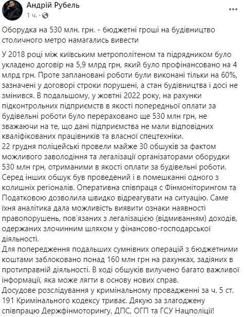Он заявил, что 22 декабря полицейские провели около 30 обысков по факту возможного завладения и легализации организаторами сделки 530 млн грн, полученными в качестве оплаты за строительные работы.