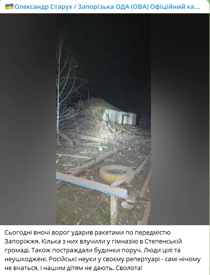 Российские войска ночью 24 декабря обстреляли пригород Запорожья. Ракеты попали в гимназию в Степенской общине.