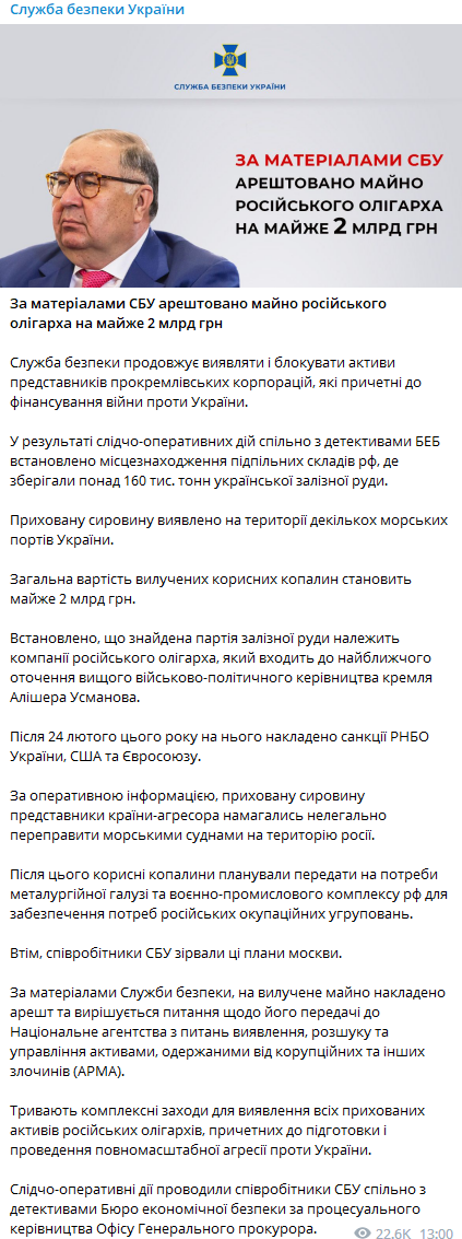В Украине арестовали имущество российского олигарха Алишера Усманова на 2 миллиарда гривен.