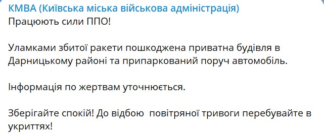 Об этом сообщает Киевская городская военная администрация в своем телеграм-канале.