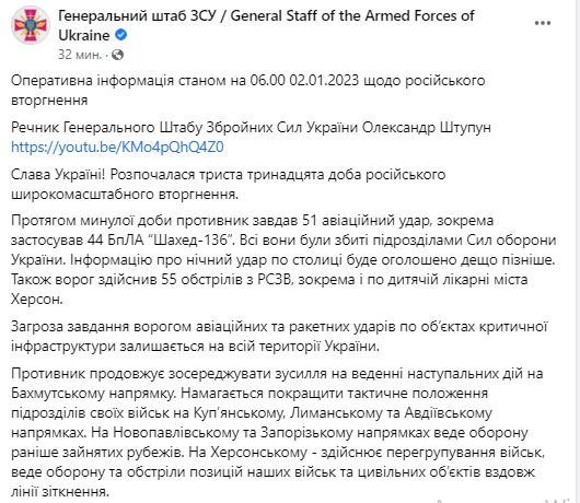 1. За прошедшие сутки противник нанес 51 авиаудар, в том числе применил 44 дрона-шахида. Все они были сбиты подразделениями сил обороны Украины (информацию о ночном ударе по Киеву пообещали обнародовать позже). Также враг совершил 55 обстрелов из РСЗО, в том числе и по детской больнице Херсона.