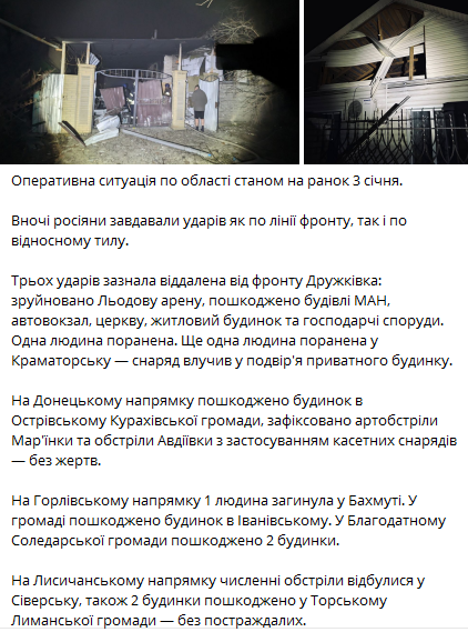 В Дружковке в результате ракетных ударов россиян, кроме Ледовой арены, повреждены также здание гостиницы МАН, автовокзал, церковь, жилой дом и хозпостройки.
