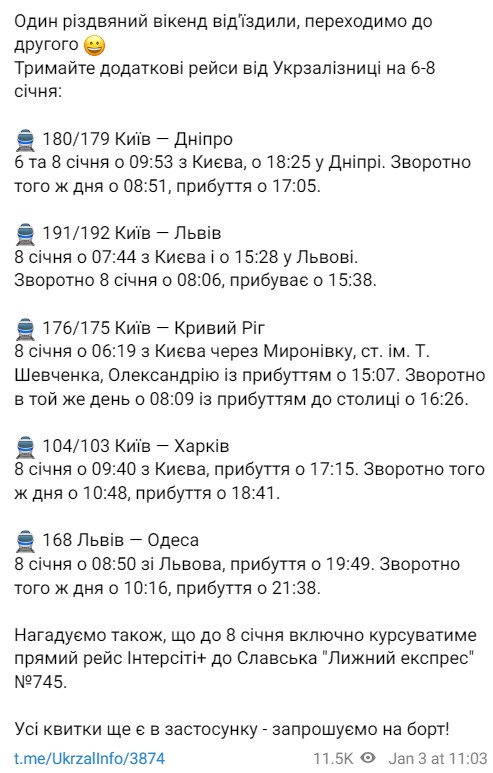Поезда будут курсировать 6-8 января. Фото: t.me/UkrzalInfo