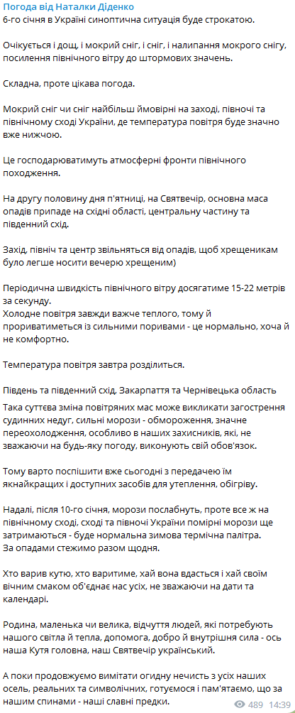 7 января  морозы усилятся. В ночные часы на протяжении 7-9 января вероятны -10...-17 градусов, однако преимущественно на востоке, северо-востоке, в центре и на севере Украины. Юго-запад и западные области Украины меньше всего почувствуют это холодное атмосферное вторжение.
