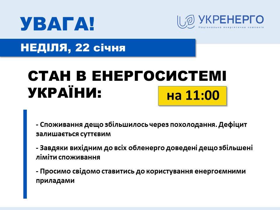 Потребление электроэнергии по состояние на воскресное утро, 22 января, - несколько больше, чем вчера. Дефицит мощности остается существенным.