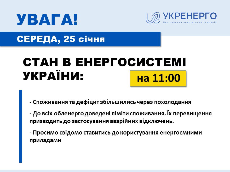 В Украине 25 января из-за похолодания растет потребление электричества и увеличивается дефицит мощности энергосистемы.