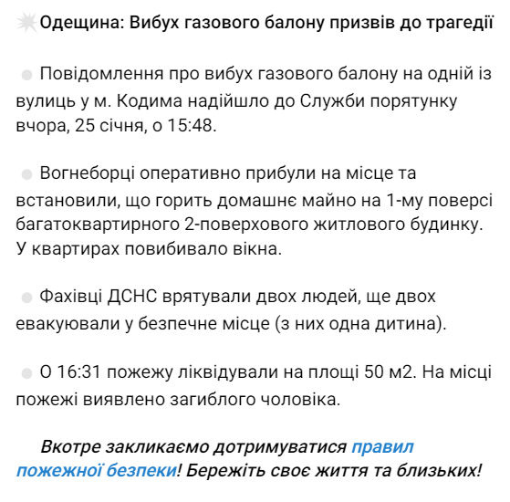 Так, о взрыве газового баллона на одной из улиц в г. Кодыма поступило в Службу спасения вчера, 25 января, в 15:48.
