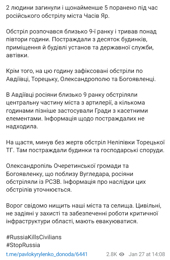 Об этом 27 января сообщает глава Донецкой ОВА Павел Кириленко.