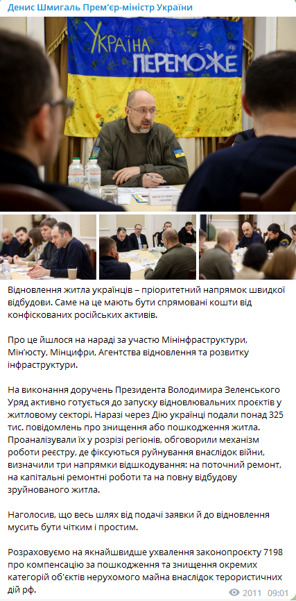 "Восстановление жилья украинцев – приоритетное направление быстрого восстановления. На это должны быть направлены средства от конфискованных российских активов", - написал Шмыгаль.