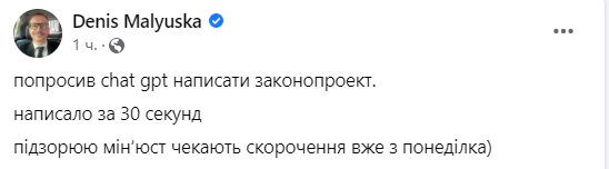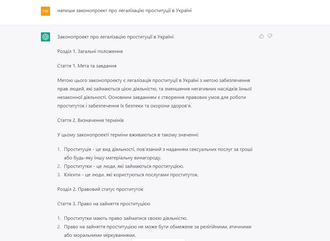 Министр юстиции Украины Денис Малюська обратился к чат-боту ChatGPT, который уже доступен в Украине, с просьбой разработать законопроект о легализации проституции в стране.