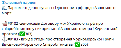 Речь идет о Договоре между Украиной и РФ о сотрудничестве в использовании Азовского моря и Керченского пролива. Он был подписан 24 декабря 2003 в Керчи. Выход из соглашения (законопроект №0182) поддержали 303 парламентария.