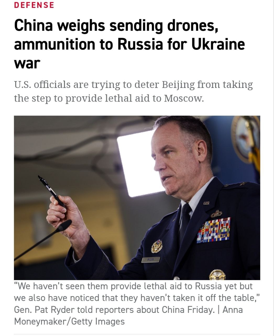 По данным источников газеты Politico, Китай рассматривает возможность отправки в РФ беспилотников, боеприпасов и стрелкового оружия.