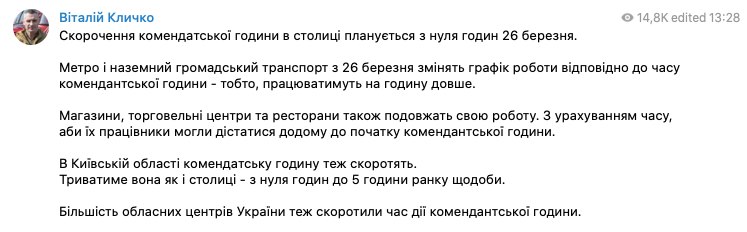 Кличко отмечает, что большинство областных центров Украины также сократили время действия комендантского часа.