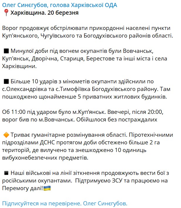 Об этом сообщает глава Харьковской ОВА Олег Синегубов в телеграм-канале.